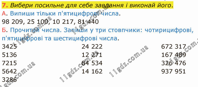 Вибери посильне для себе завдання і виконай його. А. Випиши тільки п'ятицифрові числа. 98 209, 25 100, 10 217, 81 440 Б. Прочитай числа. Запиши у три стовпчики: чотирицифрові, п'ятицифрові та шестицифрові числа. 3425 5136 7215 5642 3286 24 222 12 271 84 534 14 162 672 317 167 489 326 476 937 951