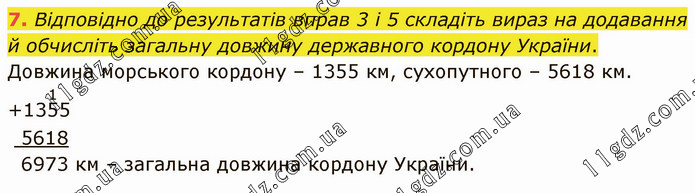 Відповідно до результатів вправ 3 і 5 складіть вираз на додавання й обчисліть загальну довжину державного кордону України. Довжина морського кордону – 1355 км, сухопутного – 5618 км.
