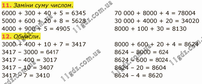 Заміни суму числом. 6000 + 300 + 40 + 5 = 6345 5000 + 600 + 20 + 8 = 5628 4000 + 900 + 5 = 4905 70 000 + 8000 + 4 = 78004 30 000 + 4000 + 20 = 34020 8000 + 100 + 30 = 8130 12. Обчисли. 3000 + 400 + 10 + 7 = 3417 3417 – 3000 = 6417 3417 – 400 = 3017 3417 – 10 = 3407 3417 – 7 = 3410 8000 + 600 + 20 + 4 = 8624 8624 – 8000 = 624 8624 – 600 = 8024 8624 – 20 = 8604 8624 – 4 = 8620