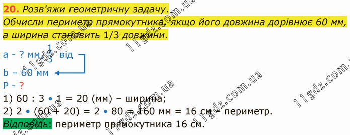 Розв'яжи геометричну задачу. Обчисли периметр прямокутника, якщо його довжина дорівнює 60 мм, а ширина становить 1/3 довжини. 1) 60 : 3 • 1 = 20 (мм) – ширина; 2) 2 • (60 + 20) = 2 • 80 = 160 мм = 16 см – периметр. Відповідь: периметр прямокутника 16 см.