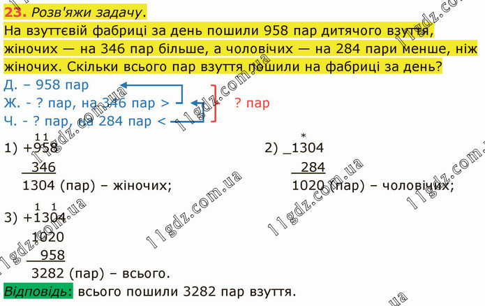 Розв'яжи задачу. На взуттєвій фабриці за день пошили 958 пар дитячого взуття, жіночих — на 346 пар більше, а чоловічих — на 284 пари менше, ніж жіночих. Скільки всього пар взуття пошили на фабриці за день?