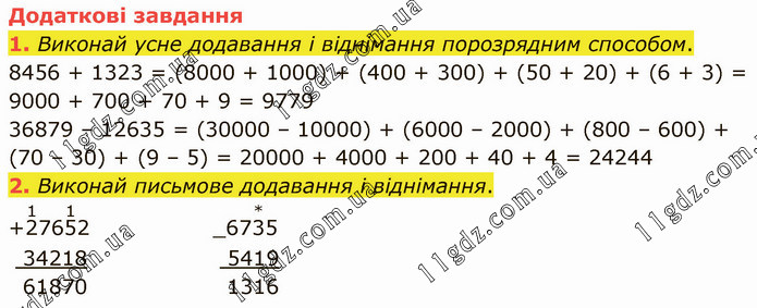 Виконай усне додавання і віднімання порозрядним способом. 8456 + 1323 = (8000 + 1000) + (400 + 300) + (50 + 20) + (6 + 3) = 9000 + 700 + 70 + 9 = 9779 36879 – 12635 = (30000 – 10000) + (6000 – 2000) + (800 – 600) + (70 – 30) + (9 – 5) = 20000 + 4000 + 200 + 40 + 4 = 24244 2. Виконай письмове додавання і віднімання.