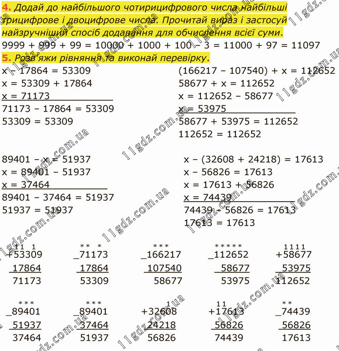 Додай до найбільшого чотирицифрового числа найбільші трицифрове і двоцифрове числа. Прочитай вираз і застосуй найзручніший спосіб додавання для обчислення всієї суми. 9999 + 999 + 99 = 10000 + 1000 + 100 – 3 = 11000 + 97 = 11097 5. Розв'яжи рівняння та виконай перевірку. х – 17864 = 53309 х = 53309 + 17864 х = 71173___________ 71173 – 17864 = 53309 53309 = 53309 (166217 – 107540) + х = 112652 58677 + х = 112652 х = 112652 – 58677 х = 53975____________ 58677 + 53975 = 112652 112652 = 112652 89401 – х = 51937 х = 89401 – 51937 х = 37464__________ 89401 – 37464 = 51937 51937 = 51937 х – (32608 + 24218) = 17613 х – 56826 = 17613 х = 17613 + 56826 х = 74439___________ 74439 – 56826 = 17613 17613 = 17613