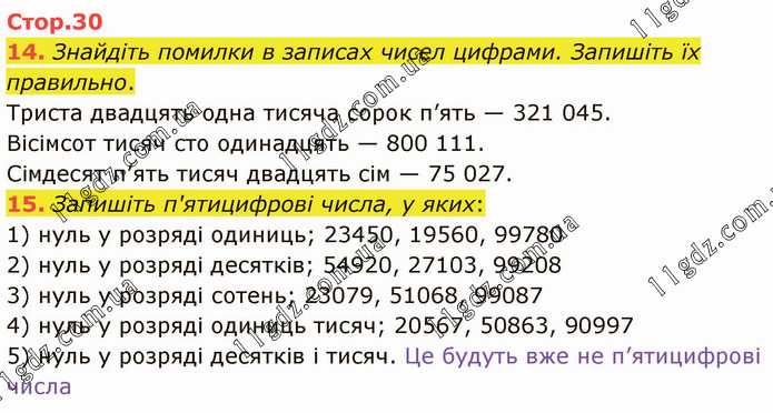 Знайдіть помилки в записах чисел цифрами. Запишіть їх правильно. Триста двадцять одна тисяча сорок п’ять — 321 045. Вісімсот тисяч сто одинадцять — 800 111. Сімдесят п’ять тисяч двадцять сім — 75 027. 15. Запишіть п'ятицифрові числа, у яких: 1) нуль у розряді одиниць; 23450, 19560, 99780 2) нуль у розряді десятків; 54920, 27103, 99208 3) нуль у розряді сотень; 23079, 51068, 99087 4) нуль у розряді одиниць тисяч; 20567, 50863, 90997 5) нуль у розряді десятків і тисяч. Це будуть вже не п’ятицифрові числа
