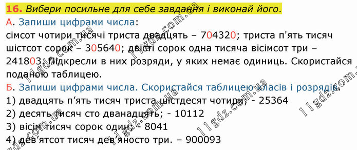 Вибери посильне для себе завдання і виконай його. А. Запиши цифрами числа: сімсот чотири тисячі триста двадцять – 704320; триста п'ять тисяч шістсот сорок – 305640; двісті сорок одна тисяча вісімсот три – 241803. Підкресли в них розряди, у яких немає одиниць. Скористайся поданою таблицею. Б. Запиши цифрами числа. Скористайся таблицею класів і розрядів. 1) двадцять п’ять тисяч триста шістдесят чотири; - 25364 2) десять тисяч сто дванадцять; - 10112 3) вісім тисяч сорок один; - 8041 4) дев’ятсот тисяч дев’яносто три. – 900093