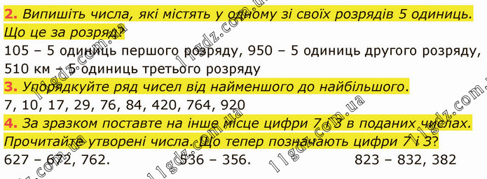 Випишіть числа, які містять у одному зі своїх розрядів 5 одиниць. Що це за розряд? 105 – 5 одиниць першого розряду, 950 – 5 одиниць другого розряду, 510 км – 5 одиниць третього розряду 3. Упорядкуйте ряд чисел від найменшого до найбільшого. 7, 10, 17, 29, 76, 84, 420, 764, 920 4. За зразком поставте на інше місце цифри 7 і 3 в поданих числах. Прочитайте утворені числа. Що тепер позначають цифри 7 і З? 627 – 672, 762. 536 – 356. 823 – 832, 382