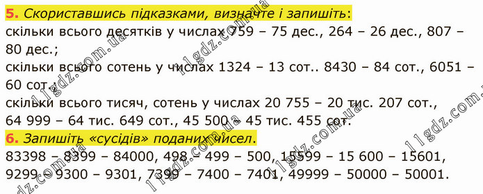 Скориставшись підказками, визначте і запишіть: скільки всього десятків у числах 759 – 75 дес., 264 – 26 дес., 807 – 80 дес.; скільки всього сотень у числах 1324 – 13 сот.. 8430 – 84 сот., 6051 – 60 сот.; скільки всього тисяч, сотень у числах 20 755 – 20 тис. 207 сот., 64 999 – 64 тис. 649 сот., 45 500 – 45 тис. 455 сот. 6. Запишіть «сусідів» поданих чисел. 83398 – 8399 – 84000, 498 – 499 – 500, 15599 – 15 600 – 15601, 9299 – 9300 – 9301, 7399 – 7400 – 7401, 49999 – 50000 – 50001.