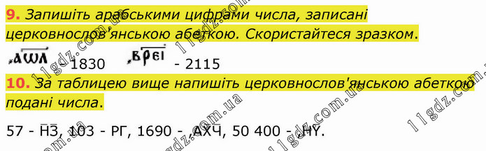 Запишіть арабськими цифрами числа, записані церковнослов'янською абеткою. Скористайтеся зразком. - 1830 - 2115 10. За таблицею вище напишіть церковнослов'янською абеткою подані числа. 57 - НЗ(__), 103 - РГ, 1690 - ,АХЧ(__), 50 400 - ,НY(_).