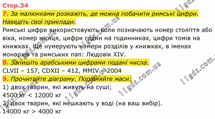 За малюнками розкажіть, де можна побачити римські цифри. Наведіть свої приклади. Римські цифри використовують коли позначають номер століття або віка, номер місяця, цифри годин на годинниках, цифри томів на книжках. Ще нумерують номери розділів у книжках, в іменах монархів та римських пап: Людовік XIV. 8. Запишіть арабськими цифрами подані числа. CLVII – 157, CDXII – 412, MMIV – 2004 9. Прочитайте діаграму. Порівняйте маси: 1) двох тварин, які живуть на суші; 4500 кг < 12000 кг 2) двох тварин, які мешкають у воді (на ваш вибір). 14000 кг > 4000 кг