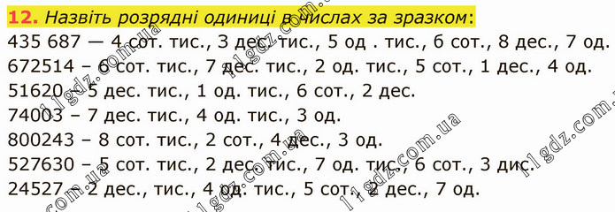 Назвіть розрядні одиниці в числах за зразком: 435 687 — 4 сот. тис., З дес. тис., 5 од . тис., б сот., 8 дес., 7 од. 672514 – 6 сот. тис., 7 дес. тис., 2 од. тис., 5 сот., 1 дес., 4 од. 51620 – 5 дес. тис., 1 од. тис., 6 сот., 2 дес. 74003 – 7 дес. тис., 4 од. тис., 3 од. 800243 – 8 сот. тис., 2 сот., 4 дес., 3 од. 527630 – 5 сот. тис., 2 дес. тис., 7 од. тис., 6 сот., 3 дис. 24527 – 2 дес., тис., 4 од. тис., 5 сот., 2 дес., 7 од.