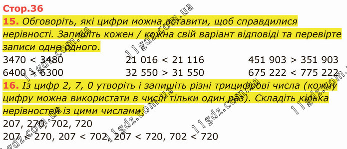 Обговоріть, які цифри можна вставити, щоб справдилися нерівності. Запишіть кожен / кожна свій варіант відповіді та перевірте записи одне одного. 3470 < 3480 6400 > 6300 21 016 < 21 116 32 550 > 31 550 451 903 > 351 903 675 222 < 775 222 16. Із цифр 2, 7, 0 утворіть і запишіть різні трицифрові числа (кожну цифру можна використати в числі тільки один раз). Складіть кілька нерівностей із цими числами. 207, 270, 702, 720 207 < 270, 207 < 702, 207 < 720, 702 < 720