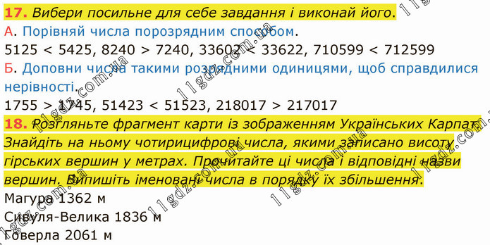 Вибери посильне для себе завдання і виконай його. А. Порівняй числа порозрядним способом. 5125 < 5425, 8240 > 7240, 33602 < 33622, 710599 < 712599 Б. Доповни числа такими розрядними одиницями, щоб справдилися нерівності. 1755 > 1745, 51423 < 51523, 218017 > 217017 18. Розгляньте фрагмент карти із зображенням Українських Карпат. Знайдіть на ньому чотирицифрові числа, якими записано висоту гірських вершин у метрах. Прочитайте ці числа і відповідні назви вершин. Випишіть іменовані числа в порядку їх збільшення. Магура 1362 м Сивуля-Велика 1836 м Говерла 2061 м