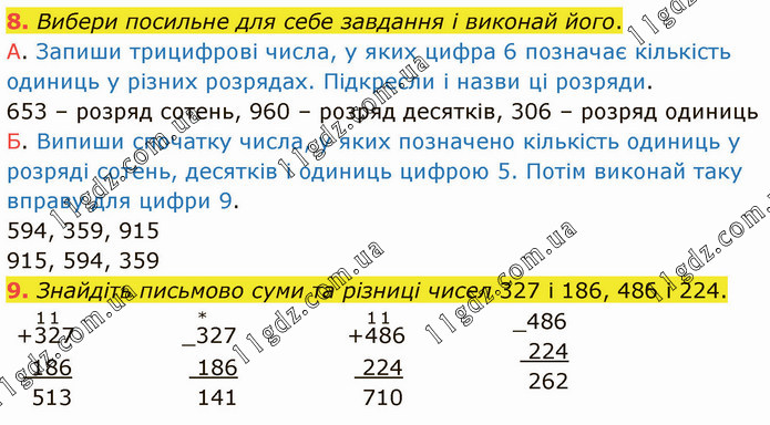 Вибери посильне для себе завдання і виконай його. А. Запиши трицифрові числа, у яких цифра 6 позначає кількість одиниць у різних розрядах. Підкресли і назви ці розряди. 653 – розряд сотень, 960 – розряд десятків, 306 – розряд одиниць Б. Випиши спочатку числа, у яких позначено кількість одиниць у розряді сотень, десятків і одиниць цифрою 5. Потім виконай таку вправу для цифри 9. 594, 359, 915 915, 594, 359