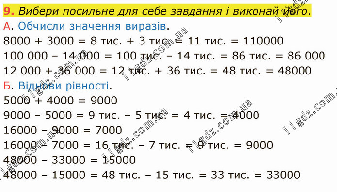 Вибери посильне для себе завдання і виконай його. А. Обчисли значення виразів. 8000 + 3000 = 8 тис. + 3 тис. = 11 тис. = 110000 100 000 – 14 000 = 100 тис. – 14 тис. = 86 тис. = 86 000 12 000 + 36 000 = 12 тис. + 36 тис. = 48 тис. = 48000 Б. Віднови рівності. 5000 + 4000 = 9000 9000 – 5000 = 9 тис. – 5 тис. = 4 тис. = 4000 16000 – 9000 = 7000 16000 – 7000 = 16 тис. – 7 тис. = 9 тис. = 9000 48000 – 33000 = 15000 48000 – 15000 = 48 тис. – 15 тис. = 33 тис. = 33000