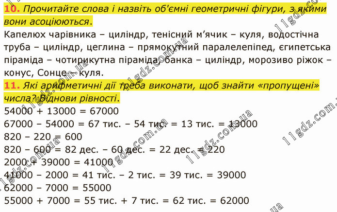 Прочитайте слова і назвіть об'ємні геометричні фігури, з якими вони асоціюються. Капелюх чарівника – циліндр, тенісний м’ячик – куля, водостічна труба – циліндр, цеглина – прямокутний паралелепіпед, єгипетська піраміда – чотирикутна піраміда, банка – циліндр, морозиво ріжок – конус, Сонце – куля. 11. Які арифметичні дії треба виконати, щоб знайти «пропущені» числа? Віднови рівності. 54000 + 13000 = 67000 67000 – 54000 = 67 тис. – 54 тис. = 13 тис. = 13000 820 – 220 = 600 820 – 600 = 82 дес. – 60 дес. = 22 дес. = 220 2000 + 39000 = 41000 41000 – 2000 = 41 тис. – 2 тис. = 39 тис. = 39000 62000 – 7000 = 55000 55000 + 7000 = 55 тис. + 7 тис. = 62 тис. = 62000