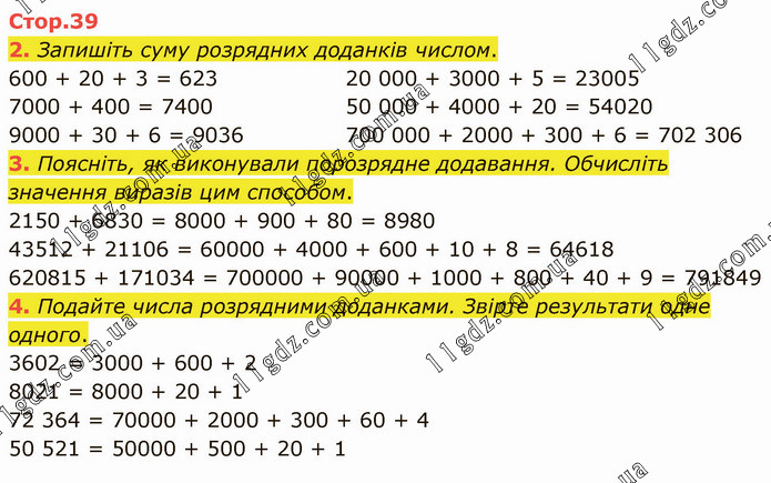 Запишіть суму розрядних доданків числом. 600 + 20 + 3 = 623 7000 + 400 = 7400 9000 + 30 + 6 = 9036 20 000 + 3000 + 5 = 23005 50 000 + 4000 + 20 = 54020 700 000 + 2000 + 300 + 6 = 702 306 3. Поясніть, як виконували порозрядне додавання. Обчисліть значення виразів цим способом. 2150 + 6830 = 8000 + 900 + 80 = 8980 43512 + 21106 = 60000 + 4000 + 600 + 10 + 8 = 64618 620815 + 171034 = 700000 + 90000 + 1000 + 800 + 40 + 9 = 791849 4. Подайте числа розрядними доданками. Звірте результати одне одного. 3602 = 3000 + 600 + 2 8021 = 8000 + 20 + 1 72 364 = 70000 + 2000 + 300 + 60 + 4 50 521 = 50000 + 500 + 20 + 1