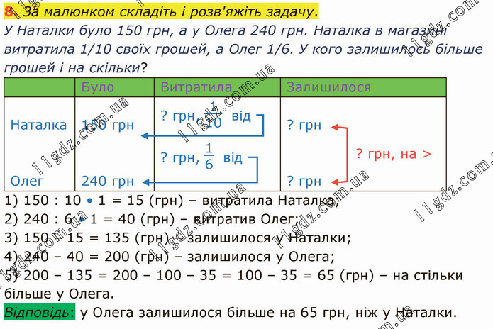 За малюнком складіть і розв'яжіть задачу. У Наталки було 150 грн, а у Олега 240 грн. Наталка в магазині витратила 1/10 своїх грошей, а Олег 1/6. У кого залишилось більше грошей і на скільки? 1) 150 : 10 • 1 = 15 (грн) – витратила Наталка; 2) 240 : 6 • 1 = 40 (грн) – витратив Олег; 3) 150 – 15 = 135 (грн) – залишилося у Наталки; 4) 240 – 40 = 200 (грн) – залишилося у Олега; 5) 200 – 135 = 200 – 100 – 35 = 100 – 35 = 65 (грн) – на стільки більше у Олега. Відповідь: у Олега залишилося більше на 65 грн, ніж у Наталки.