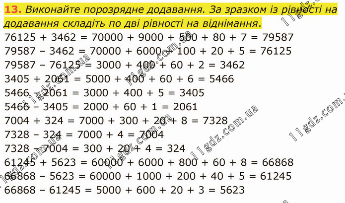 Виконайте порозрядне додавання. За зразком із рівності на додавання складіть по дві рівності на віднімання. 76125 + 3462 = 70000 + 9000 + 500 + 80 + 7 = 79587 79587 – 3462 = 70000 + 6000 + 100 + 20 + 5 = 76125 79587 – 76125 = 3000 + 400 + 60 + 2 = 3462 3405 + 2061 = 5000 + 400 + 60 + 6 = 5466 5466 – 2061 = 3000 + 400 + 5 = 3405 5466 – 3405 = 2000 + 60 + 1 = 2061 7004 + 324 = 7000 + 300 + 20 + 8 = 7328 7328 – 324 = 7000 + 4 = 7004 7328 – 7004 = 300 + 20 + 4 = 324 61245 + 5623 = 60000 + 6000 + 800 + 60 + 8 = 66868 66868 – 5623 = 60000 + 1000 + 200 + 40 + 5 = 61245 66868 – 61245 = 5000 + 600 + 20 + 3 = 5623