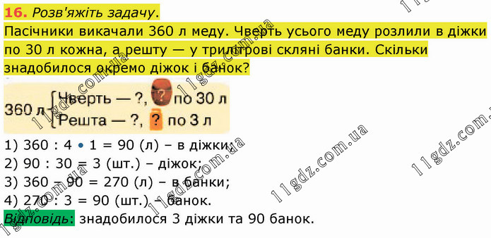 Розв'яжіть задачу. Пасічники викачали 360 л меду. Чверть усього меду розлили в діжки по 30 л кожна, а решту — у трилітрові скляні банки. Скільки знадобилося окремо діжок і банок? 1) 360 : 4 • 1 = 90 (л) – в діжки; 2) 90 : 30 = 3 (шт.) – діжок; 3) 360 – 90 = 270 (л) – в банки; 4) 270 : 3 = 90 (шт.) – банок. Відповідь: знадобилося 3 діжки та 90 банок.
