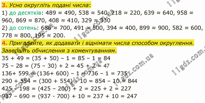 Усно округліть подані числа: 1) до десятків: 489 ≈ 490, 538 ≈ 540, 218 ≈ 220, 639 ≈ 640, 958 ≈ 960, 869 ≈ 870, 408 ≈ 410, 329 ≈ 330 2) до сотень: 686 ≈ 700, 491 ≈ 500, 394 ≈ 400, 899 ≈ 900, 582 ≈ 600, 778 ≈ 800, 195 ≈ 200. 4. Пригадайте, як додавати і віднімати числа способом округлення. Завершіть обчислення з коментуванням. 35 + 49 = (35 + 50) – 1 = 85 – 1 = 84 75 – 28 = (75 – 30) + 2 = 45 + 2 = 47 136+ 599 = (136+ 600) – 1 = 736 – 1 = 735 290 + 554 = (300 + 554) – 10 = 854 – 10 = 844 425 – 198 = (425 – 200) + 2 = 225 + 2 = 227 937 – 690 = (937 - 700) + 10 = 237 + 10 = 247