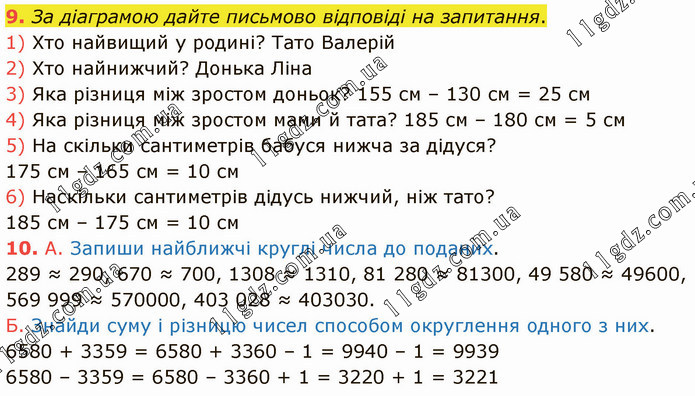 За діаграмою дайте письмово відповіді на запитання. 1) Хто найвищий у родині? Тато Валерій 2) Хто найнижчий? Донька Ліна 3) Яка різниця між зростом доньок? 155 см – 130 см = 25 см 4) Яка різниця між зростом мами й тата? 185 см – 180 см = 5 см 5) На скільки сантиметрів бабуся нижча за дідуся? 175 см – 165 см = 10 см 6) Наскільки сантиметрів дідусь нижчий, ніж тато? 185 см – 175 см = 10 см 10. А. Запиши найближчі круглі числа до поданих. 289 ≈ 290, 670 ≈ 700, 1308 ≈ 1310, 81 280 ≈ 81300, 49 580 ≈ 49600, 569 999 ≈ 570000, 403 028 ≈ 403030. Б. Знайди суму і різницю чисел способом округлення одного з них. 6580 + 3359 = 6580 + 3360 – 1 = 9940 – 1 = 9939 6580 – 3359 = 6580 – 3360 + 1 = 3220 + 1 = 3221
