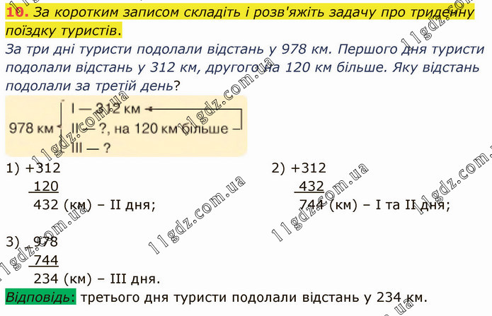 За коротким записом складіть і розв'яжіть задачу про триденну поїздку туристів. За три дні туристи подолали відстань у 978 км. Першого дня туристи подолали відстань у 312 км, другого на 120 км більше. Яку відстань подолали за третій день?