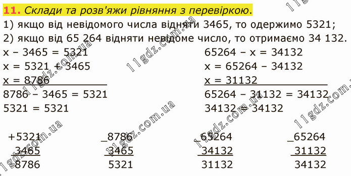Склади та розв'яжи рівняння з перевіркою. 1) якщо від невідомого числа відняти 3465, то одержимо 5321; 2) якщо від 65 264 відняти невідоме число, то отримаємо 34 132. х – 3465 = 5321 х = 5321 + 3465 х = 8786_________ 8786 – 3465 = 5321 5321 = 5321 65264 – х = 34132 х = 65264 – 34132 х = 31132___________ 65264 – 31132 = 34132 34132 = 34132