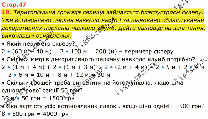 Територіальна громада селища займається благоустроєм скверу. Уже встановлено паркан навколо нього і заплановано облаштування декоративних парканів навколо клумб. Дайте відповіді на запитання, виконавши обчислення. • Який периметр скверу? 2 • (60 м + 40 м) = 2 • 100 м = 200 (м) – периметр скверу • Скільки метрів декоративного паркану навколо клумб потрібно? 2 • (1 м + 4 м) + 2 • (1 м + 3 м) + 2 • (2 м + 4 м) = 2 • 5 м + 2 • 4 м + 2 • 6 м = 10 м + 8 м + 12 м = 30 м • Скільки грошей треба витратити на його купівлю, якщо ціна однометрової секції 50 грн? 30 м • 50 грн = 1500 грн • Яка вартість усіх встановлених лавок , якщо ціна однієї — 500 грн? 8 • 500 грн = 4000 грн
