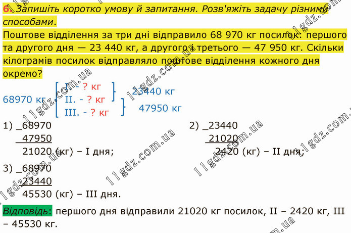 Запишіть коротко умову й запитання. Розв'яжіть задачу різними способами. Поштове відділення за три дні відправило 68 970 кг посилок: першого та другого дня — 23 440 кг, а другого і третього — 47 950 кг. Скільки кілограмів посилок відправляло поштове відділення кожного дня окремо?