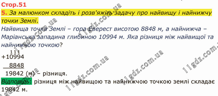 За малюнком складіть і розв'яжіть задачу про найвищу і найнижчу точки Землі. Найвища точка Землі – гора Еверест висотою 8848 м, а найнижча – Маріанська западина глибиною 10994 м. Яка різниця між найвищої та найнижчою точкою?