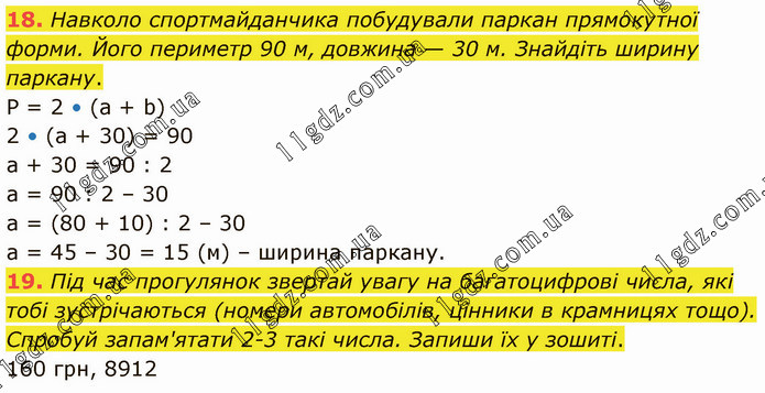 Навколо спортмайданчика побудували паркан прямокутної форми. Його периметр 90 м, довжина — 30 м. Знайдіть ширину паркану. P = 2 • (a + b) 2 • (a + 30) = 90 a + 30 = 90 : 2 a = 90 : 2 – 30 а = (80 + 10) : 2 – 30 а = 45 – 30 = 15 (м) – ширина паркану. 19. Під час прогулянок звертай увагу на багатоцифрові числа, які тобі зустрічаються (номери автомобілів, цінники в крамницях тощо). Спробуй запам'ятати 2-3 такі числа. Запиши їх у зошиті. 160 грн, 8912