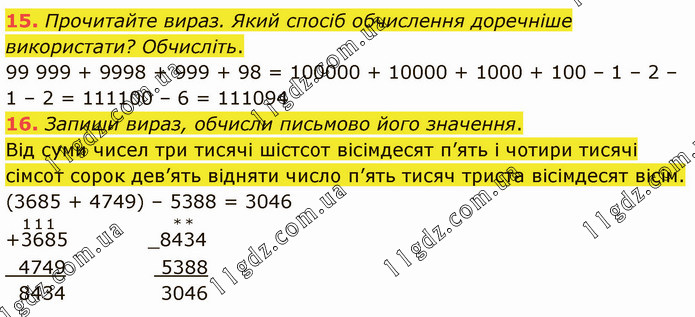 Прочитайте вираз. Який спосіб обчислення доречніше використати? Обчисліть. 99 999 + 9998 + 999 + 98 = 100000 + 10000 + 1000 + 100 – 1 – 2 – 1 – 2 = 111100 – 6 = 111094 16. Запиши вираз, обчисли письмово його значення. Від суми чисел три тисячі шістсот вісімдесят п’ять і чотири тисячі сімсот сорок дев’ять відняти число п’ять тисяч триста вісімдесят вісім. (3685 + 4749) – 5388 = 3046