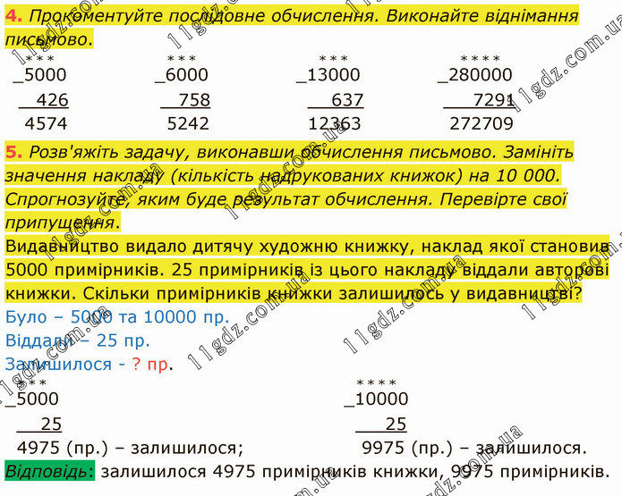 Розв'яжіть задачу, виконавши обчислення письмово. Замініть значення накладу (кількість надрукованих книжок) на 10 000. Спрогнозуйте, яким буде результат обчислення. Перевірте свої припущення. Видавництво видало дитячу художню книжку, наклад якої становив 5000 примірників. 25 примірників із цього накладу віддали авторові книжки. Скільки примірників книжки залишилось у видавництві?