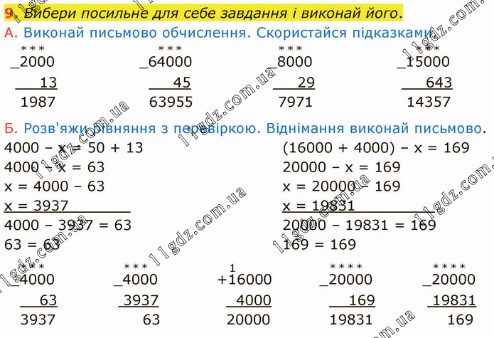 Б. Розв'яжи рівняння з перевіркою. Віднімання виконай письмово. 4000 – х = 50 + 13 4000 – х = 63 х = 4000 – 63 х = 3937_______ 4000 – 3937 = 63 63 = 63 (16000 + 4000) – х = 169 20000 – х = 169 х = 20000 – 169 х = 19831_________ 20000 – 19831 = 169 169 = 169
