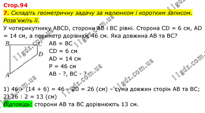 Складіть геометричну задачу за малюнком і коротким записом. Розв'яжіть її. У чотирикутнику АВСD, сторони АВ і ВС рівні. Сторона CD = 6 см, AD = 14 см, а периметр дорівнює 46 см. Яка довжина АВ та ВС? АВ = ВС CD = 6 см AD = 14 см Р = 46 см АВ - ?, ВС - ? 1) 46 – (14 + 6) = 46 – 20 = 26 (см) – сума довжин сторін АВ та ВС; 2) 26 : 2 = 13 (см) Відповідь: сторони АВ та ВС дорівнюють 13 см.