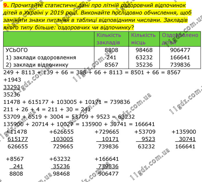 Прочитайте статистичні дані про літній оздоровчий відпочинок дітей в Україні у 2019 році. Виконайте послідовно обчислення, щоб замінити знаки питання в таблиці відповідними числами. Закладів якого типу більше: оздоровчих чи відпочинку? УСЬОГО 1) заклади оздоровлення 2) заклади відпочинку 8808 241 8567 98468 63232 35236 906477 166641 739836