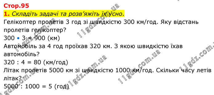 1. Складіть задачі та розв’яжіть їх усно. Гелікоптер пролетів 3 год зі швидкістю 300 км/год. Яку відстань пролетів гелікоптер? 300 • 3 = 900 (км) Автомобіль за 4 год проїхав 320 км. З якою швидкістю їхав автомобіль? 320 : 4 = 80 (км/год) Літак пролетів 5000 км зі швидкістю 1000 км/год. Скільки часу летів літак? 5000 : 1000 = 5 (год)