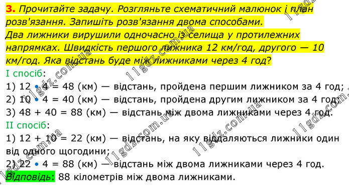 Прочитайте задачу. Розгляньте схематичний малюнок і план розв'язання. Запишіть розв'язання двома способами. Два лижники вирушили одночасно із селища у протилежних напрямках. Швидкість першого лижника 12 км/год, другого — 10 км/год. Яка відстань буде між лижниками через 4 год? І спосіб: 1) 12 • 4 = 48 (км) — відстань, пройдена першим лижником за 4 год; 2) 10 • 4 = 40 (км) — відстань, пройдена другим лижником за 4 год; 3) 48 + 40 = 88 (км) — відстань між двома лижниками через 4 год. ІІ спосіб: 1) 12 + 10 = 22 (км) — відстань, на яку віддаляються лижники один від одного щогодини; 2) 22 • 4 = 88 (км) — відстань між двома лижниками через 4 год. Відповідь: 88 кілометрів між двома лижниками.