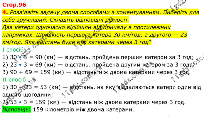Розв'яжіть задачу двома способами з коментуванням. Виберіть для себе зручніший. Складіть відповідні рівності. Два катери одночасно відійшли від причалу в протилежних напрямках. Швидкість першого катера 30 км/год, а другого — 23 км/год. Яка відстань буде між катерами через 3 год? І спосіб: 1) 30 • 3 = 90 (км) — відстань, пройдена першим катером за 3 год; 2) 23 • 3 = 69 (км) — відстань, пройдена другим катером за 3 год; 3) 90 + 69 = 159 (км) — відстань між двома катерами через 3 год. ІІ спосіб: 1) 30 + 23 = 53 (км) — відстань, на яку віддаляються катери один від одного щогодини; 2) 53 • 3 = 159 (км) — відстань між двома катерами через 3 год. Відповідь: 159 кілометрів між двома катерами.