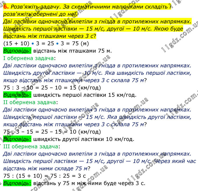 Розв'яжіть задачу. За схематичними малюнками складіть і розв'яжіть обернені до неї. Дві ластівки одночасно вилетіли з гнізда в протилежних напрямках. Швидкість першої ластівки — 15 м/с, другої — 10 м/с. Якою буде відстань між пташками через 3 с? (15 + 10) • 3 = 25 • 3 = 75 (м) Відповідь: відстань між пташками 75 м. І обернена задача: Дві ластівки одночасно вилетіли з гнізда в протилежних напрямках. Швидкість другої ластівки — 10 м/с. Яка швидкість першої ластівки, якщо відстань між пташками через 3 с склала 75 м? 75 : 3 – 10 = 25 – 10 = 15 (км/год) Відповідь: швидкість першої ластівки 15 км/год. ІІ обернена задача: Дві ластівки одночасно вилетіли з гнізда в протилежних напрямках. Швидкість першої ластівки — 15 м/с. Яка швидкість другої ластівки, якщо відстань між пташками через 3 с склала 75 м? 75 : 3 – 15 = 25 – 15 = 10 (км/год) Відповідь: швидкість другої ластівки 10 км/год. ІІІ обернена задача: Дві ластівки одночасно вилетіли з гнізда в протилежних напрямках. Швидкість першої ластівки — 15 м/с, другої — 10 м/с. Через який час відстань між ними складе 75 м? 75 : (15 + 10) = 75 : 25 = 3 с Відповідь: відстань у 75 м між ними буде через 3 с.