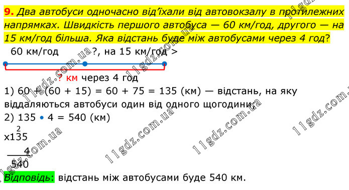 Два автобуси одночасно від’їхали від автовокзалу в протилежних напрямках. Швидкість першого автобуса — 60 км/год, другого — на 15 км/год більша. Яка відстань буде між автобусами через 4 год? 1) 60 + (60 + 15) = 60 + 75 = 135 (км) — відстань, на яку віддаляються автобуси один від одного щогодини; 2) 135 • 4 = 540 (км)