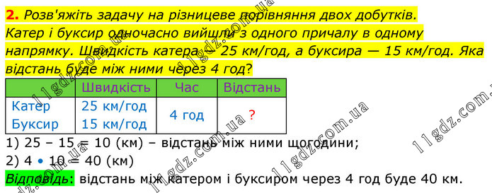 Розв'яжіть задачу на різницеве порівняння двох добутків. Катер і буксир одночасно вийшли з одного причалу в одному напрямку. Швидкість катера — 25 км/год, а буксира — 15 км/год. Яка відстань буде між ними через 4 год? 1) 25 – 15 = 10 (км) – відстань між ними щогодини; 2) 4 • 10 = 40 (км) Відповідь: відстань між катером і буксиром через 4 год буде 40 км.