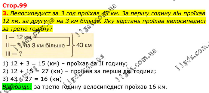 Велосипедист за 3 год проїхав 43 км. За першу годину він проїхав 12 км, за другу — на 3 км більше. Яку відстань проїхав велосипедист за третю годину? 1) 12 + 3 = 15 (км) – проїхав за ІІ годину; 2) 12 + 15 = 27 (км) – проїхав за перши дві години; 3) 43 – 27 = 16 (км) Відповідь: за третю годину велосипедист проїхав 16 км.