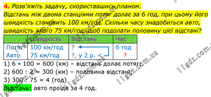 Розв'яжіть задачу, скориставшись планом. Відстань між двома станціями потяг долає за 6 год, при цьому його швидкість становить 100 км/год. Скільки часу знадобиться авто, швидкість якого 75 км/год, щоб подолати половину цієї відстані? 1) 6 • 100 = 600 (км) – відстань долає потяг; 2) 600 : 2 = 300 (км) – половина відстані; 3) 300 : 75 = 4 (год) Відстань: авто проїде за 4 год.