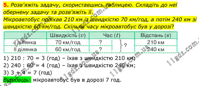 Розв'яжіть задачу, скориставшись таблицею. Складіть до неї обернену задачу та розв'яжіть її. Мікроавтобус проїхав 210 км із швидкістю 70 км/год, а потім 240 км зі швидкістю 60 км/год. Скільки часу мікроавтобус був у дорозі? 1) 210 : 70 = 3 (год) – їхав з швидкістю 210 км; 2) 240 : 60 = 4 (год) – їхав з швидкістю 240 км; 3) 3 + 4 = 7 (год) Відповідь: мікроавтобус був в дорозі 7 год.