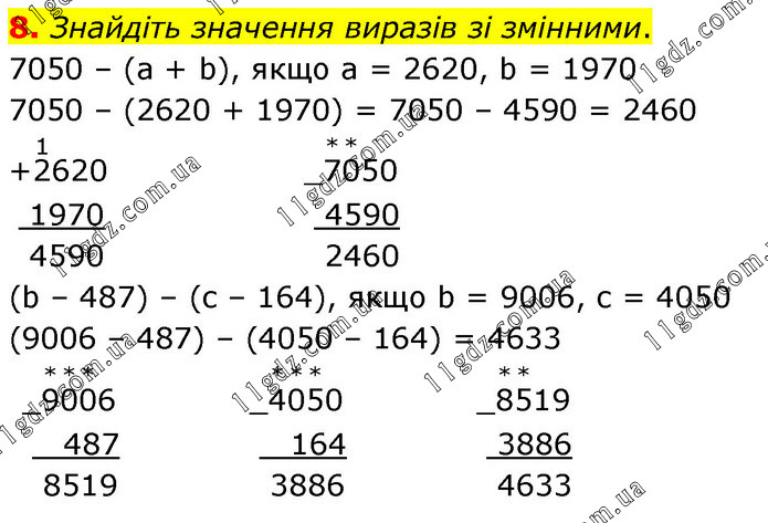 Знайдіть значення виразів зі змінними. 7050 – (а + b), якщо а = 2620, b = 1970 7050 – (2620 + 1970) = 7050 – 4590 = 2460 (b – 487) – (с – 164), якщо b = 9006, с = 4050 (9006 – 487) – (4050 – 164) = 4633