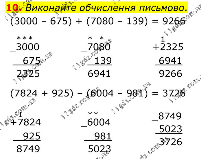 Виконайте обчислення письмово. (3000 – 675) + (7080 – 139) = 9266 (7824 + 925) – (6004 – 981) = 3726