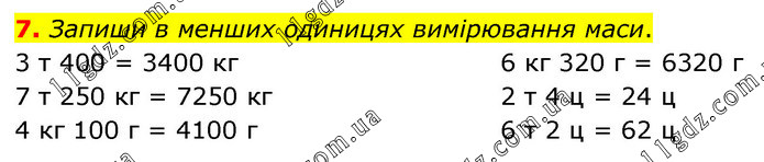 Запиши в менших одиницях вимірювання маси. 3 т 400 = 3400 кг 7 т 250 кг = 7250 кг 4 кг 100 г = 4100 г 6 кг 320 г = 6320 г 2 т 4 ц = 24 ц 6 т 2 ц = 62 ц