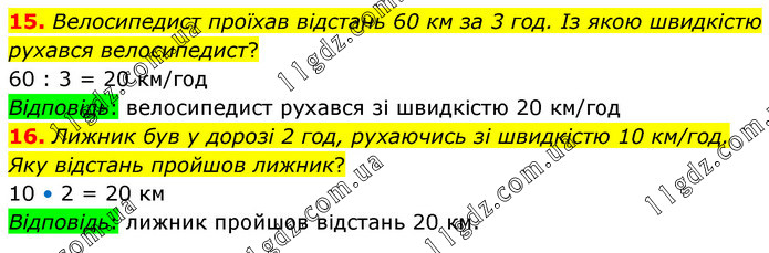 Велосипедист проїхав відстань 60 км за 3 год. Із якою швидкістю рухався велосипедист? 60 : 3 = 20 км/год Відповідь: велосипедист рухався зі швидкістю 20 км/год 16. Лижник був у дорозі 2 год, рухаючись зі швидкістю 10 км/год. Яку відстань пройшов лижник? 10 • 2 = 20 км Відповідь: лижник пройшов відстань 20 км.