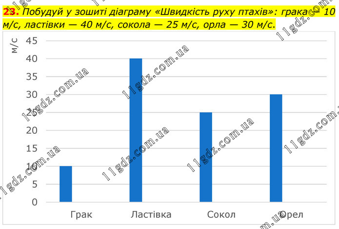 Побудуй у зошиті діаграму «Швидкість руху птахів»: грака — 10 м/с, ластівки — 40 м/с, сокола — 25 м/с, орла — 30 м/с.